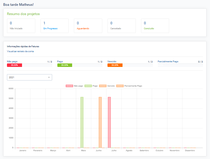 Tela inteligente, onde você verá de forma única tudo sobre o cliente: contatos, faturas, pagamentos, orçamentos, propostas, serviços e projetos, contratos, tarefas, tickets de suporte, arquivos e muito mais.